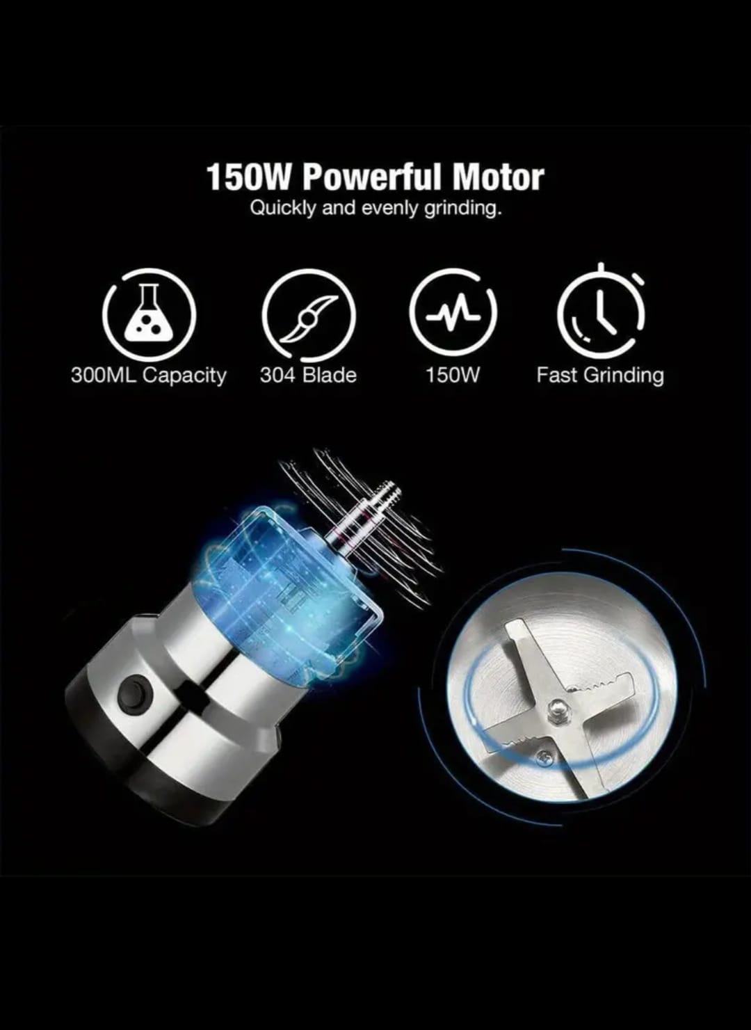 1. Cuchilla de acero inoxidable de dos hojas: la amoladora eléctrica adopta una cuchilla y un contenedor de 2 hojas de acero inoxidable de grado alimenticio, sin vibración y motor potente, que es muy adecuado para controlar los granos de café en unos segundos.